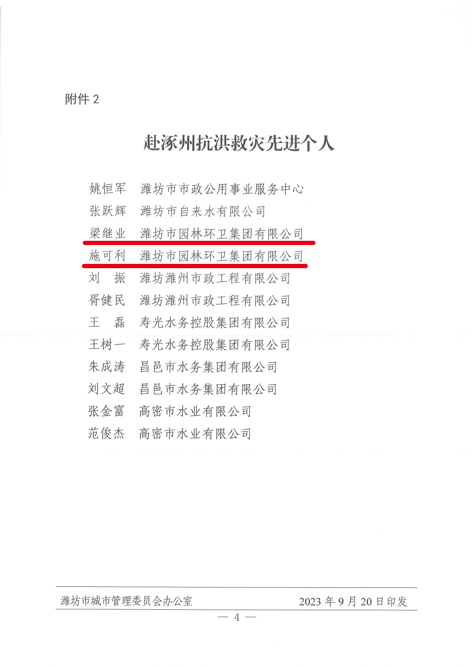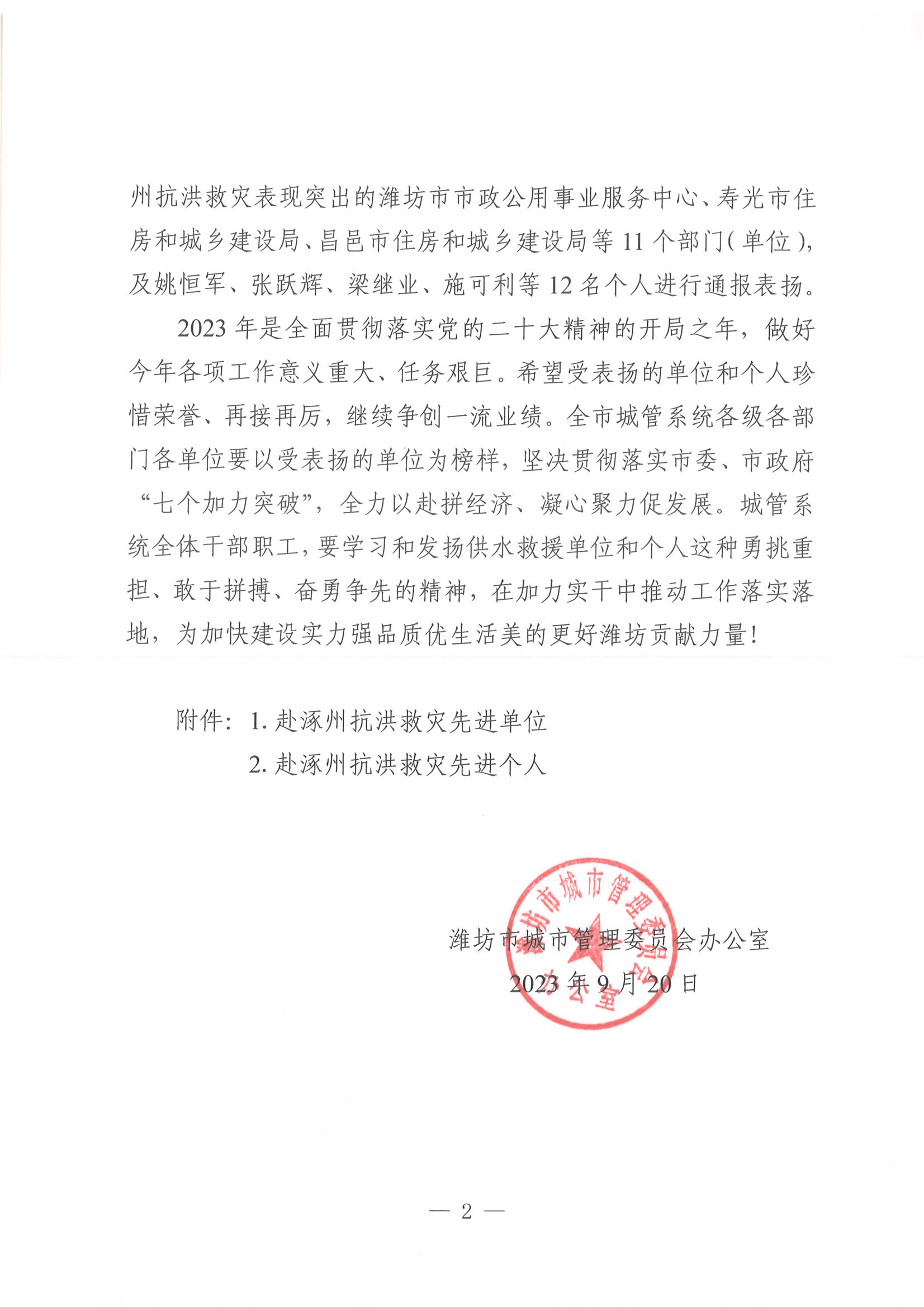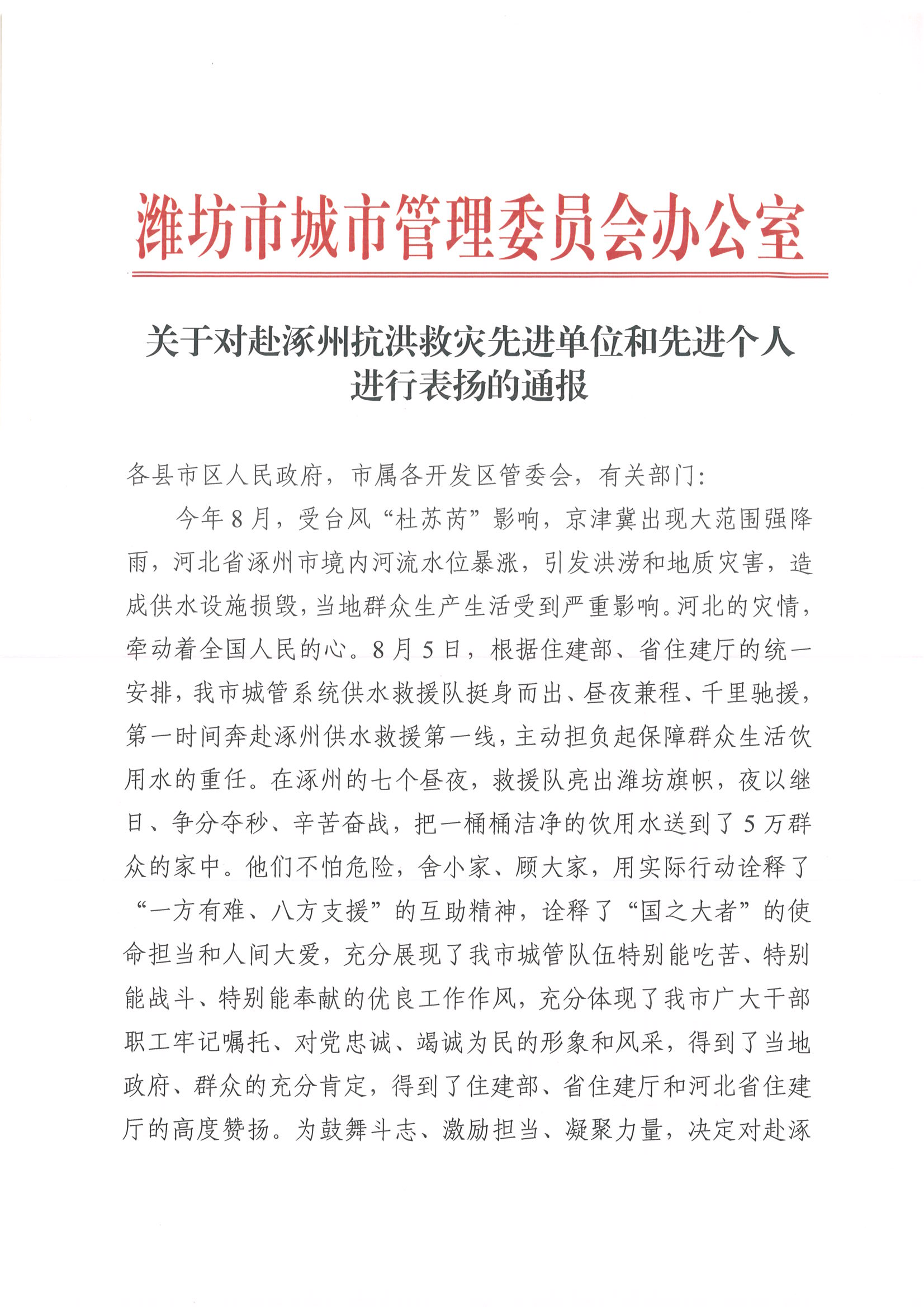 近日,市園林環(huán)衛(wèi)集團收到來自住房城鄉(xiāng)建設部辦公廳、濰坊市城市管理委員會辦公室發(fā)來的感謝信和表揚通報,感謝市園林環(huán)衛(wèi)集團在助力河北涿州開展災后應急供水工作中的突出貢獻。
