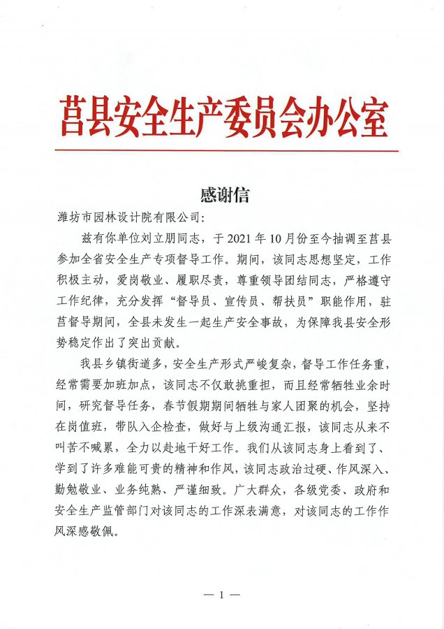 近日,濰坊市園林環(huán)衛(wèi)集團(tuán)有限公司權(quán)屬子公司濰坊市園林設(shè)計(jì)院有限公司(以下簡(jiǎn)稱園林設(shè)計(jì)院)收到莒縣安全生產(chǎn)委員會(huì)辦公室發(fā)來的感謝信,感謝園林設(shè)計(jì)院在全省安全生產(chǎn)專項(xiàng)......【點(diǎn)擊詳情】