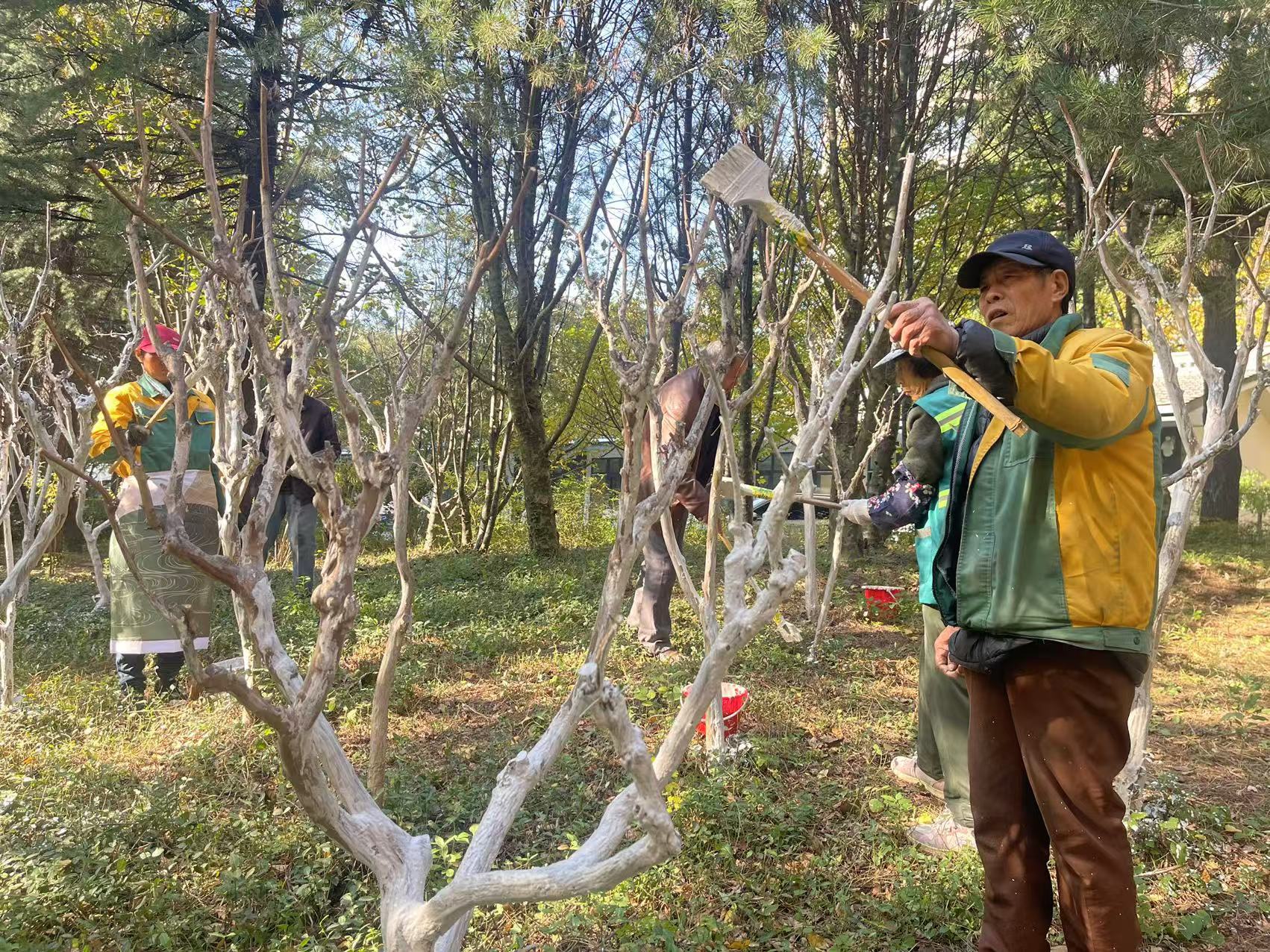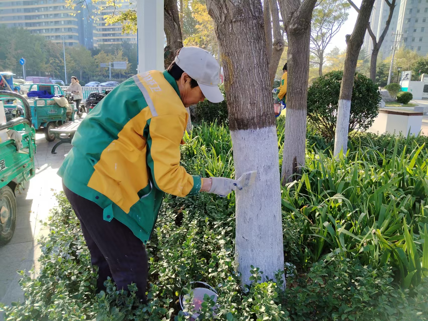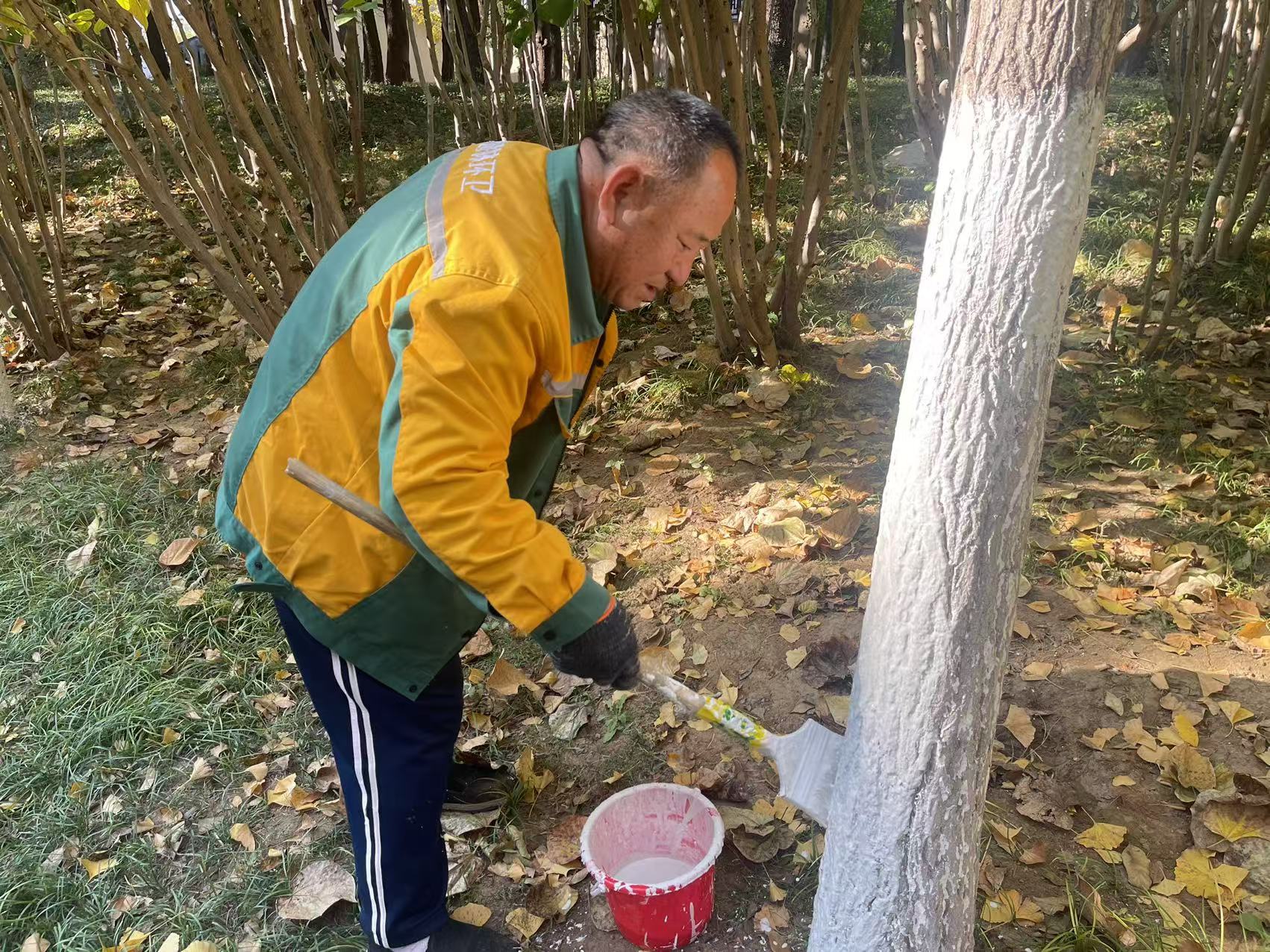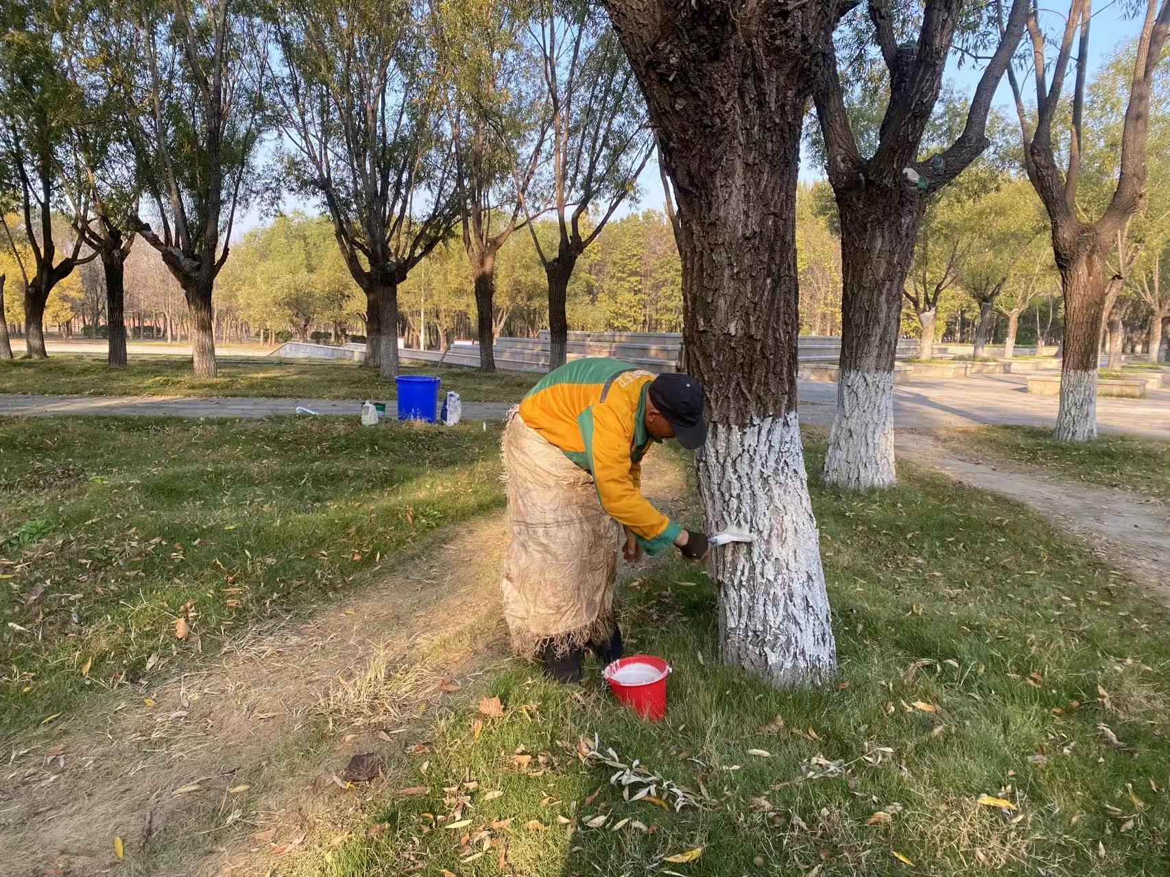 為扎實(shí)做好綠化苗木秋冬季養(yǎng)護(hù)管理工作,自11月份開始,怡景公司利用天氣晴好的有利時(shí)機(jī),組織對養(yǎng)護(hù)管理范圍內(nèi)的綠化苗木開展樹木涂白工作,為綠化苗木“穿冬裝”,確保安全過冬。目前,怡景公司樹木涂白工作正如火如荼的進(jìn)行中。怡景公司嚴(yán)格把控苗木涂白工作質(zhì)量,工作人員嚴(yán)格按照科學(xué)配比配置涂白劑,做到上口平齊,下不露“腳”,針對樹皮縫隙、洞孔等重點(diǎn)部位進(jìn)行重復(fù)涂刷,同時(shí)在涂白作業(yè)期間注意避免涂白水外濺,保持地面干凈整潔,確保涂白的樹干顏色均勻、整體美觀。